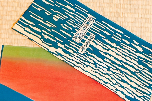 この手拭いは「細川染め」という注染の工程で二枚以上の型紙を使って染める技法を使っています。