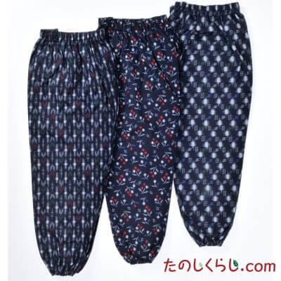 | スペック | ウエスト総ゴム使い、右前ポケットあり、裾ゴム使い |